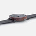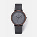 深いミッドナイトブラックが静かに輝く。天然木ウォルナットとのコントラストが際立つ、大人のための上質ミニマルウォッチ。